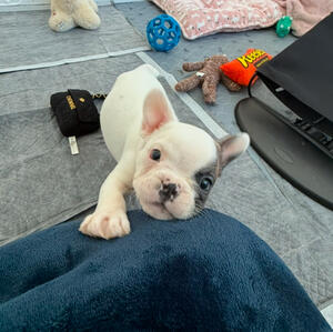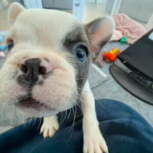 meet stella! our 8 week old pied french bulldog. she came all the way from florida. she is still used to being home but she seems really happy here